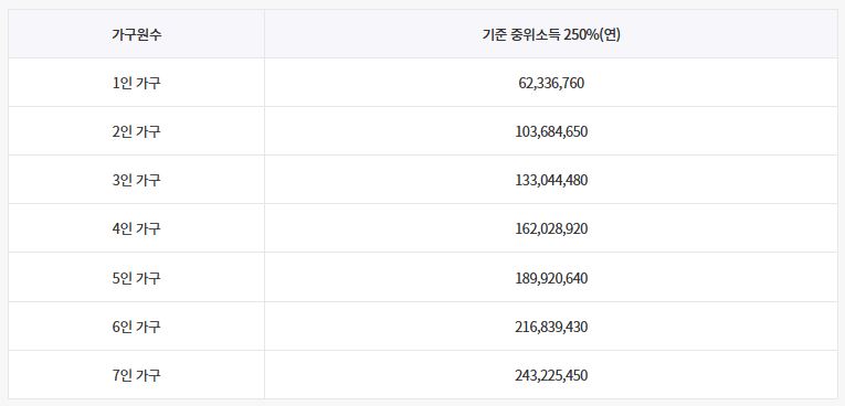 - 가구소득: 중위소득 250% 이하 (가구원 수별 기준 확인 필요)